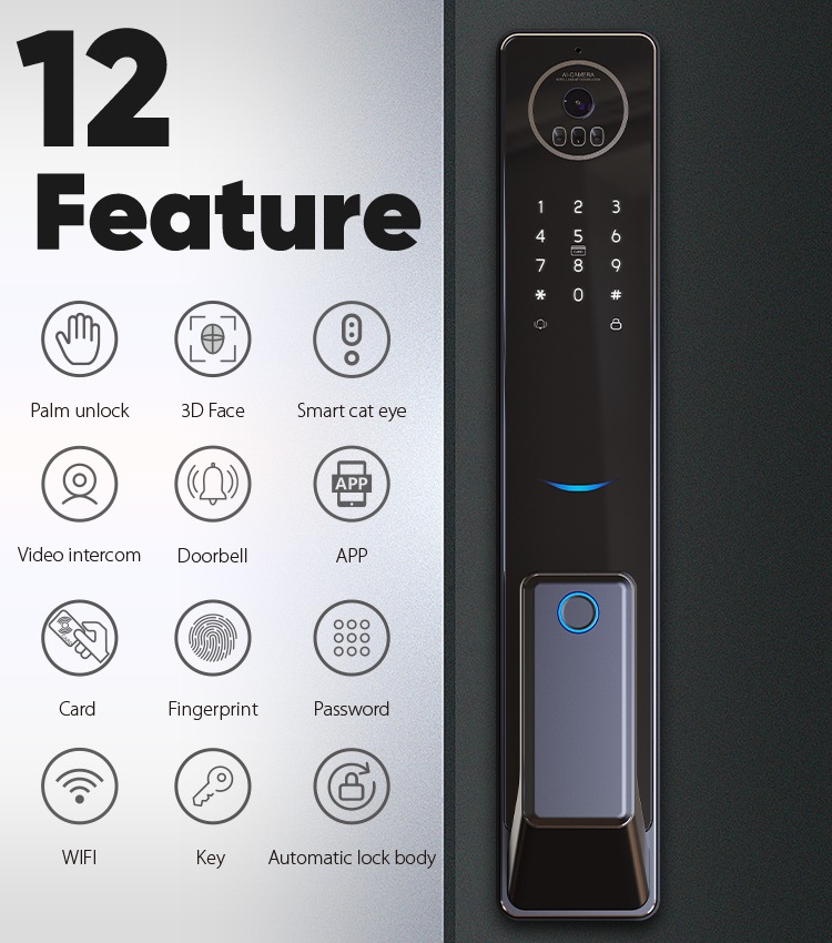 1.7 ways to unlock: Palm Veins Unlock,3D Face, APP, Fingerprint Unlock, PassCode, Card, Mechanical Key Unlock;