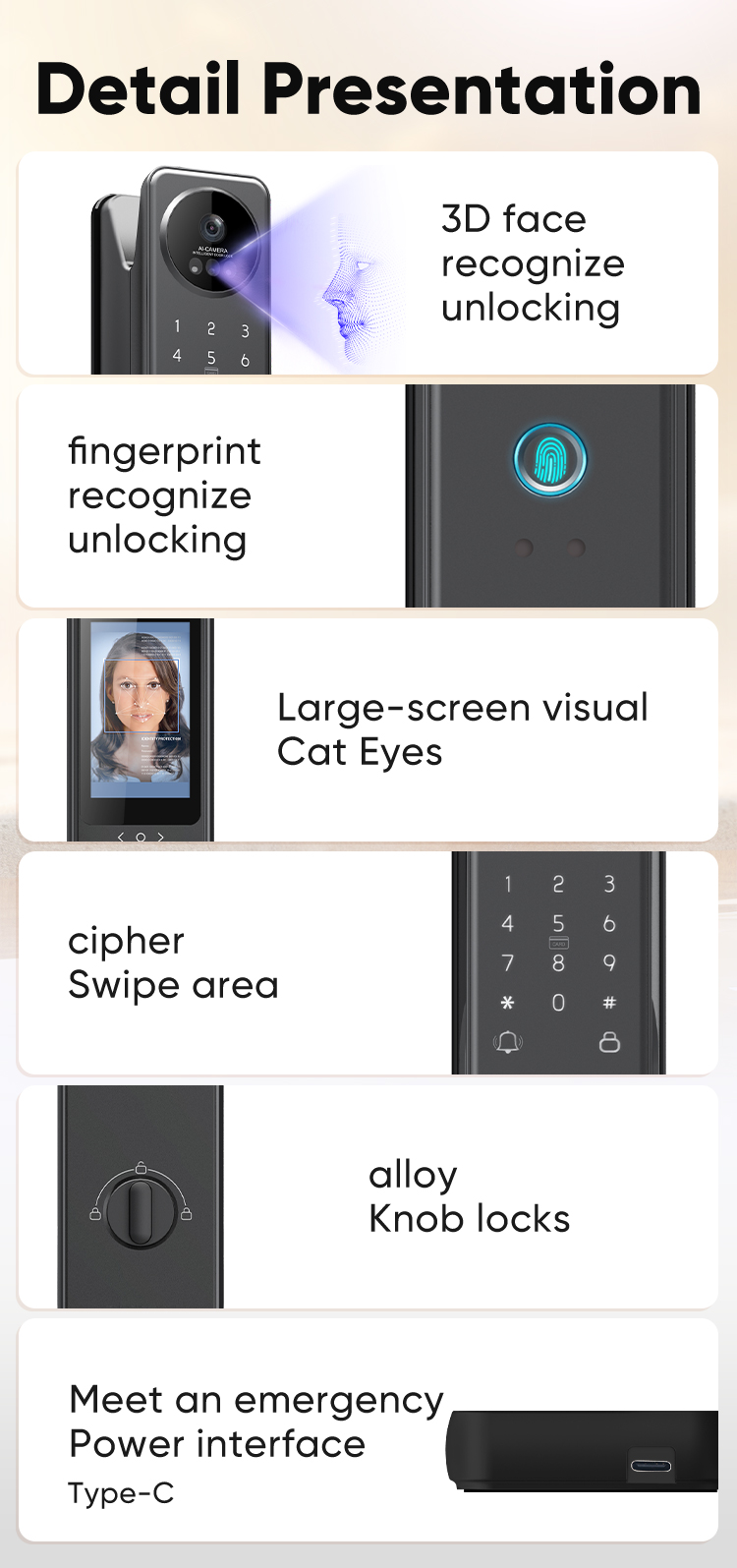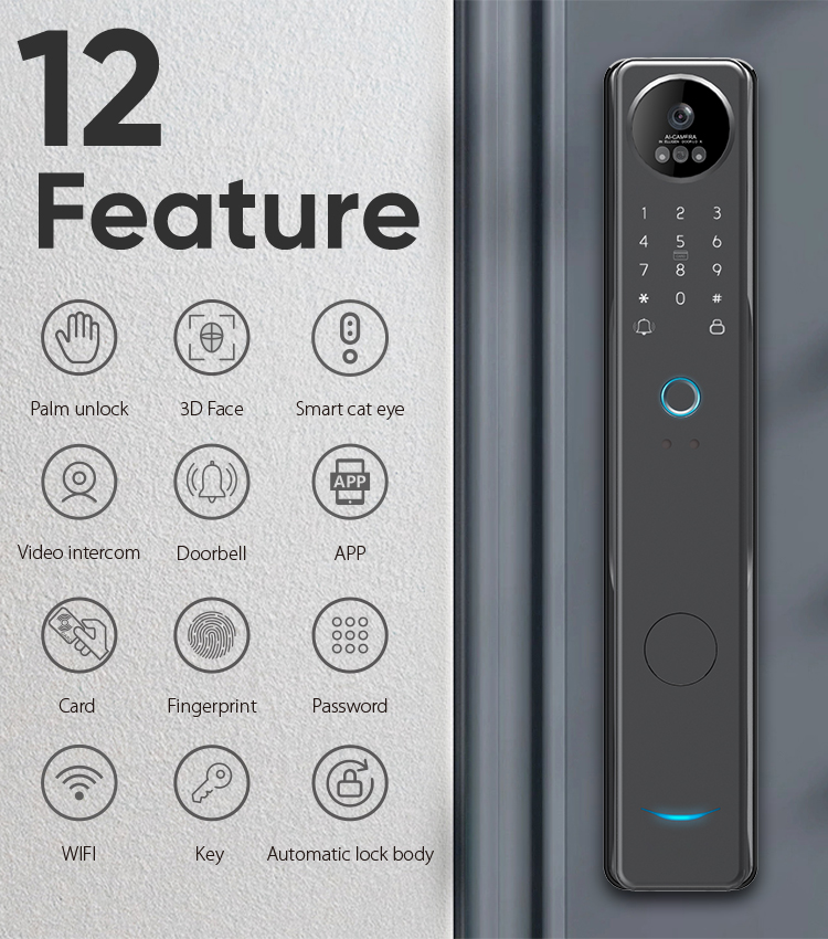 7 ways to unlock: Palm Veins Unlock,3D Face,APP, Fingerprint Unlock, Pass Code, Card, Mechanical Key Unlock;